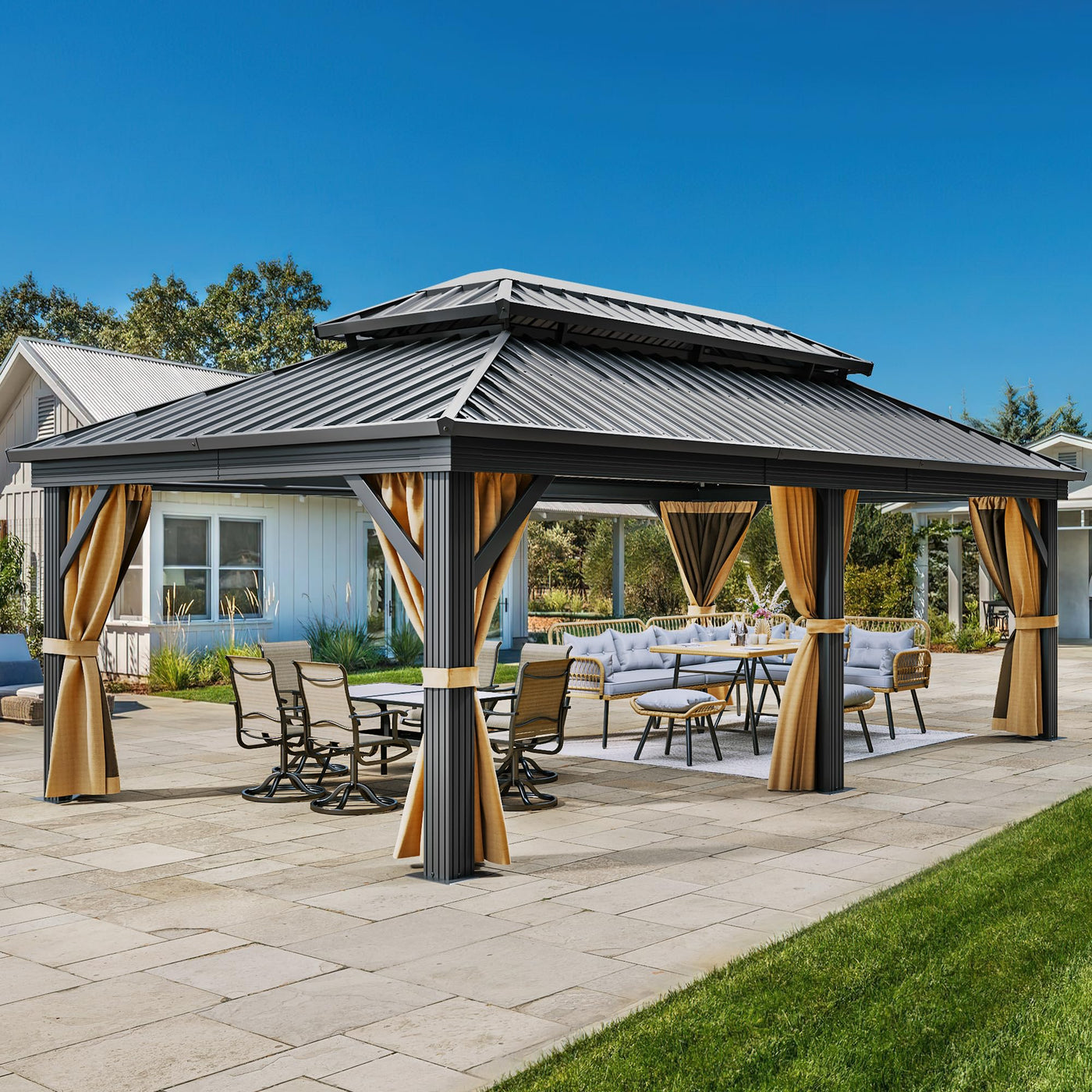 12X18 Ft Gazebo Double Roof Hardtop With Nettings And Curtains, Outdoor Heavy Duty Galvanized Steel Gazebo Permanent Aluminum Frame Structure Outdoor Netting Privacy Polyester Fabric Curtains Backyard Garden Lawns Deck Events Parties Sun Shade Shelter Patios
