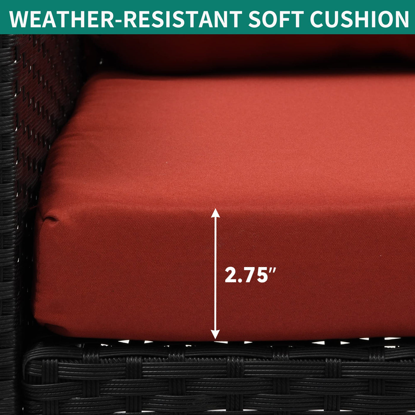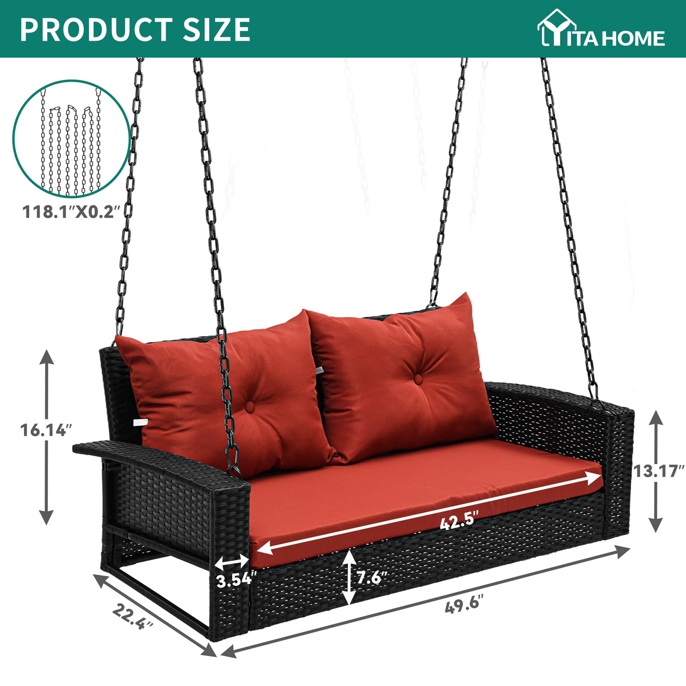 Yitahome 2-Seats Wicker Hanging Porch Swing Chair Outdoor Black Rattan Patio Swing Lounge W/ 2 Back Cushions Capacity 530Lbs For Garden, Balcony, Living Room, Red