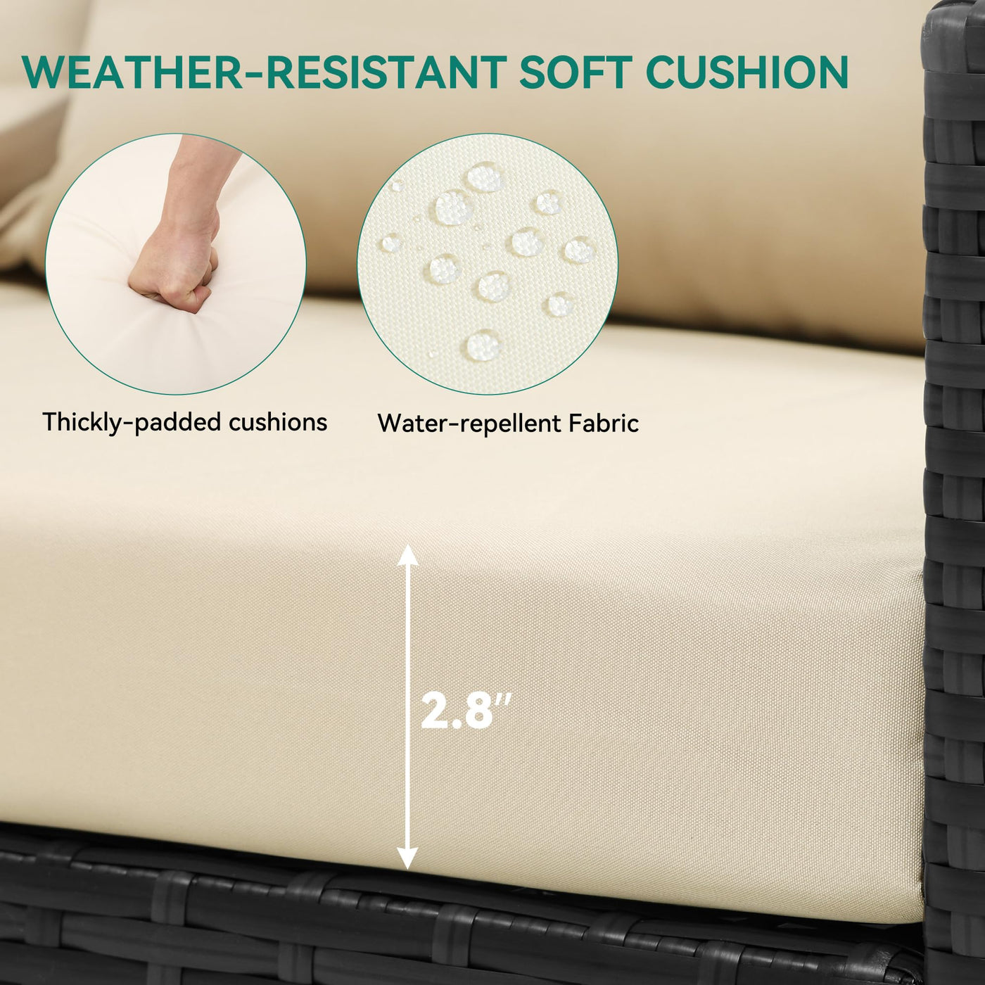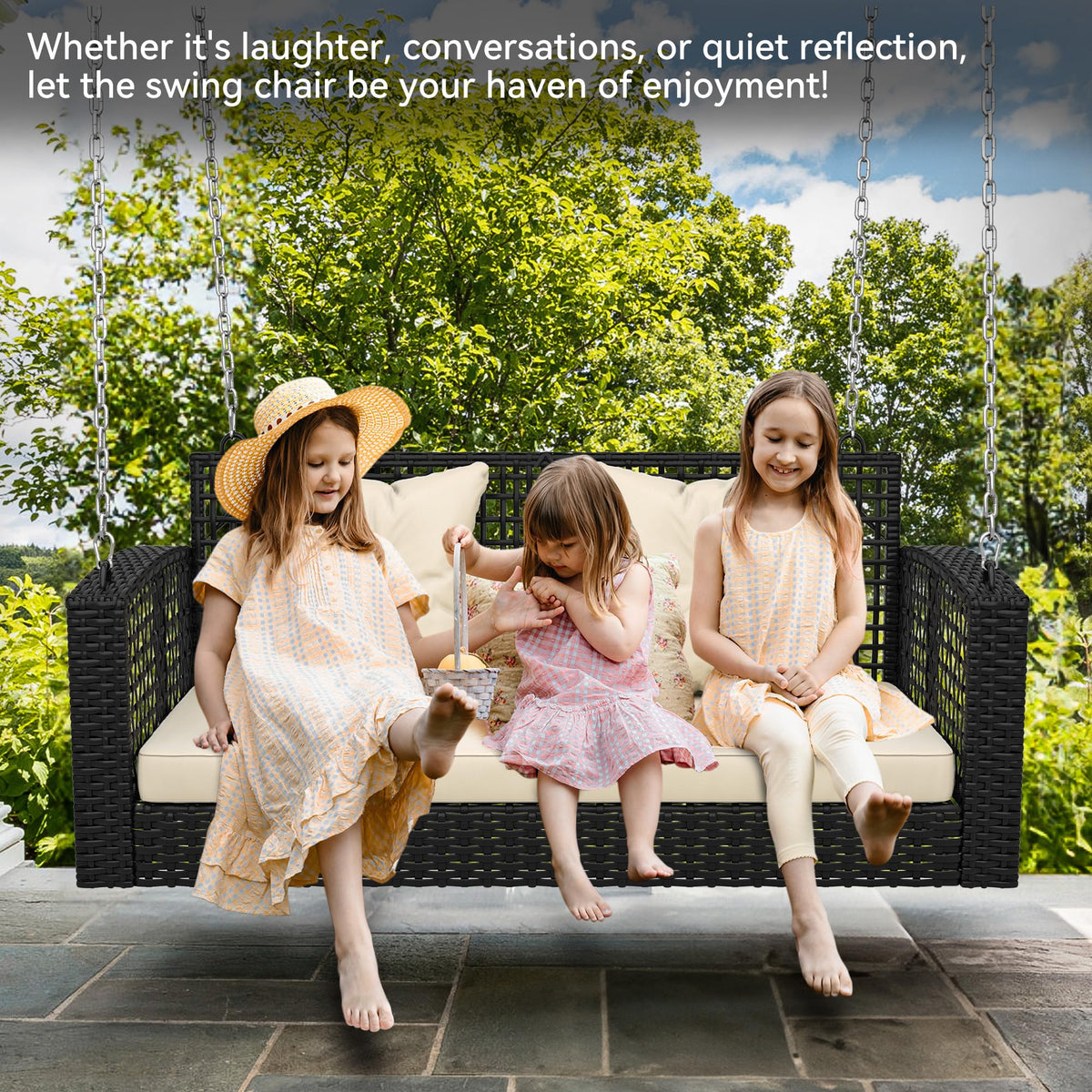 QUALITY RATTAN- The hanging swing chair adopts high-quality 8MM flat black rattan, which can resist UV for up to 1800 hours and prolong its service life. Size: 42.5' * 22.4' * 20.5'. | EXTENDED CHAIN- We are equipped with two 118 IN hanging chains. You can adjust the height of your chair through the climbing buckle to get high-quality product enjoyment | SOFT CUSHION- The wicker porch swing is made of 180g polyester cloth, with 3 soft pillows and 2.6 pounds of upright cotton. You can sit or lie down so that you can use it comfortably | STRONG CAPACITY- This patio chain bench can bear up to 794 pounds, and is suitable for 3 adults to enjoy leisure time on it | EASY TO ASSEMBLE- You can easily install this chain chair within 30min according to the instructions, Safety measures and professional installation are highly recommended