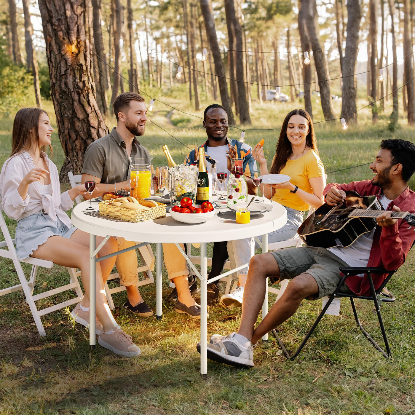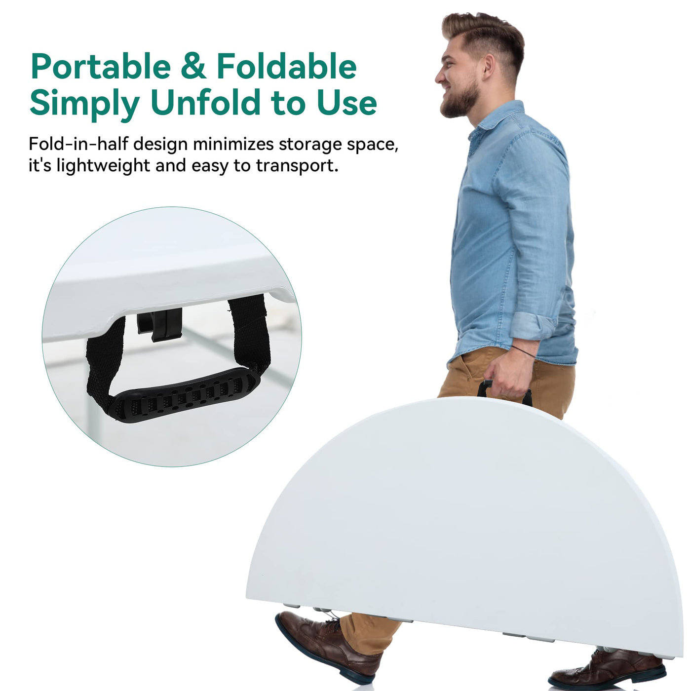 Easy Storage & Mobility: This 48 round table can be set up in seconds and folded up for compact storage when not in use; 28.22 lbs lightweight folding utility table comes with built-in carrying handle for effortless portability | Sturdy Structure: Our folding table's thicken tubing legs and stable steel frame load a carrying capacity of 330Lbs, complementing honeycomb back design that disper the pressure evenly; Features security lock and fixing buckles for added stability | Premium Material & Easy Maintance: This folding card table top is covered with a thick 1.57‘’ HDPE surface that’s solid, weather and scratch resistant, and can be easily cleaned with a damp cloth | Multipurple Usage: Minimalist style and practical functionality harmonize to offer a versatile solution for camping, picnics, parties, and events; Can be used as a barbecue side table, card table, crafting table, dining table, picnic table and so on | Ample Space: Measuring 48' L x 48' W x 29.13' H, this round folding table is spacious enough to hold up to 6 people, flexible for both indoor and outdoor events like campings, stalls, temporary banquets, etc.