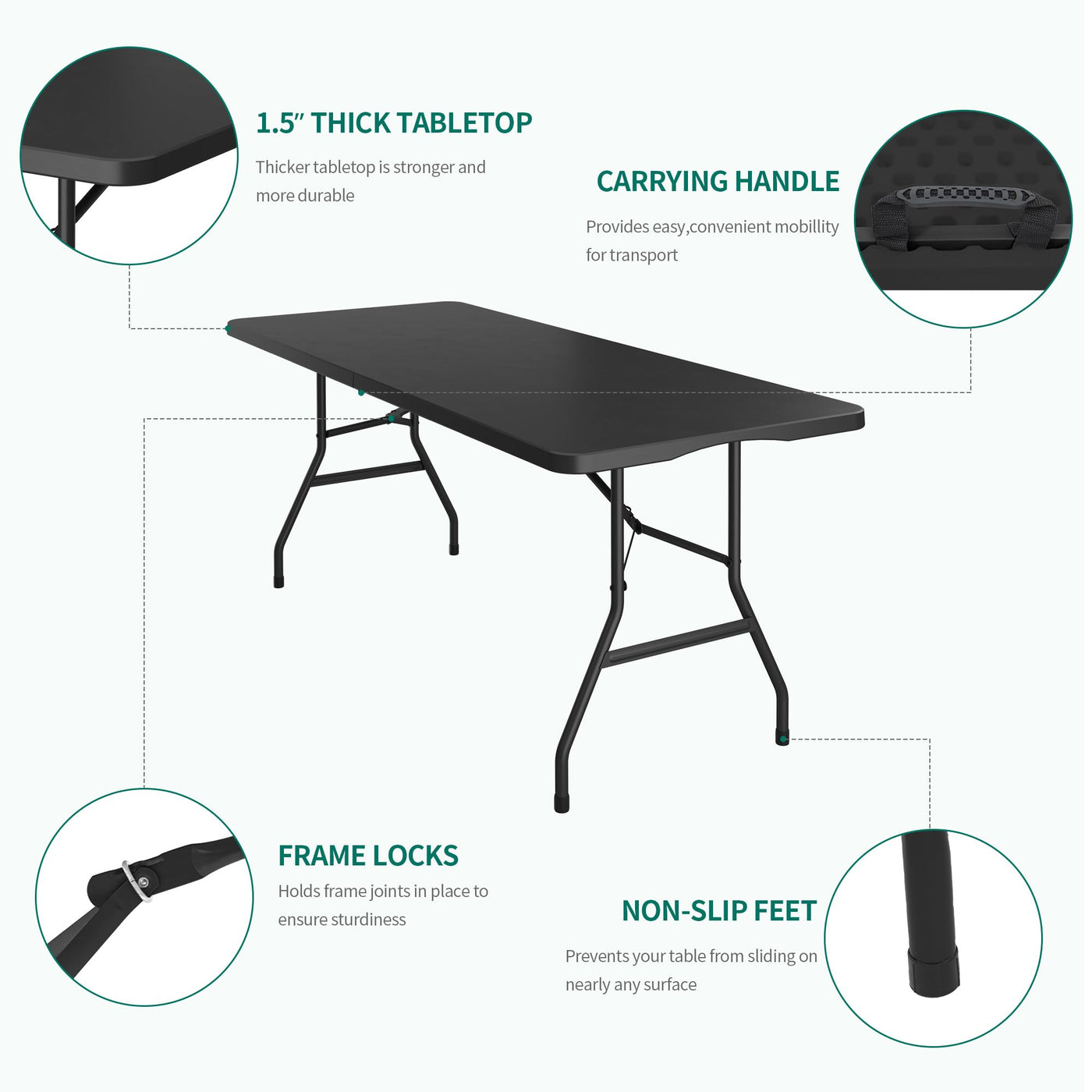Easy Storage & Mobility: Our 6 foot folding table can be set up in seconds and folded up for compact storage when not in use; 27.34 lbs lightweight table comes with built-in carrying handle for effortless portability | Sturdy Structure: Foldable table's heavy-duty steel frame complements 1.5’’ thick HDPE tabletop to grant sturdiness and wear & tear resistance; Features security lock and fixing buckles for added stability. | Flexible Foldable Table: Plastic folding table's minimalist style and practical functionality harmonize to offer a versatile solution for camping, picnics, parties, and events; Great for both indoor and outdoor areas like patio, garden, poolside, lawn, etc.; Enjoy gathering with your family, friends, and neighbors. | Easy to Clean: This folding picnic table top is covered with a waterproof resin surface that’s weather resistant and can be easily cleaned with a damp cloth. | Dimensions: Measuring 71' x 29' x 29' (L x W x H), this outdoor folding table is spacious enough to accommodate 8 adults for compact grill, snacks, fruits and dinnerware.