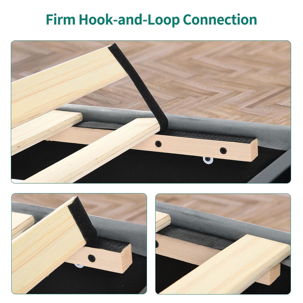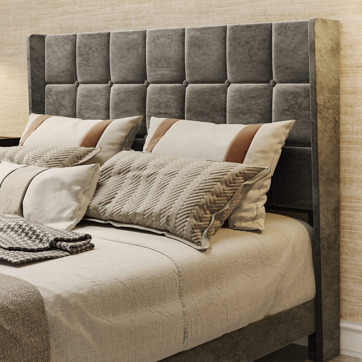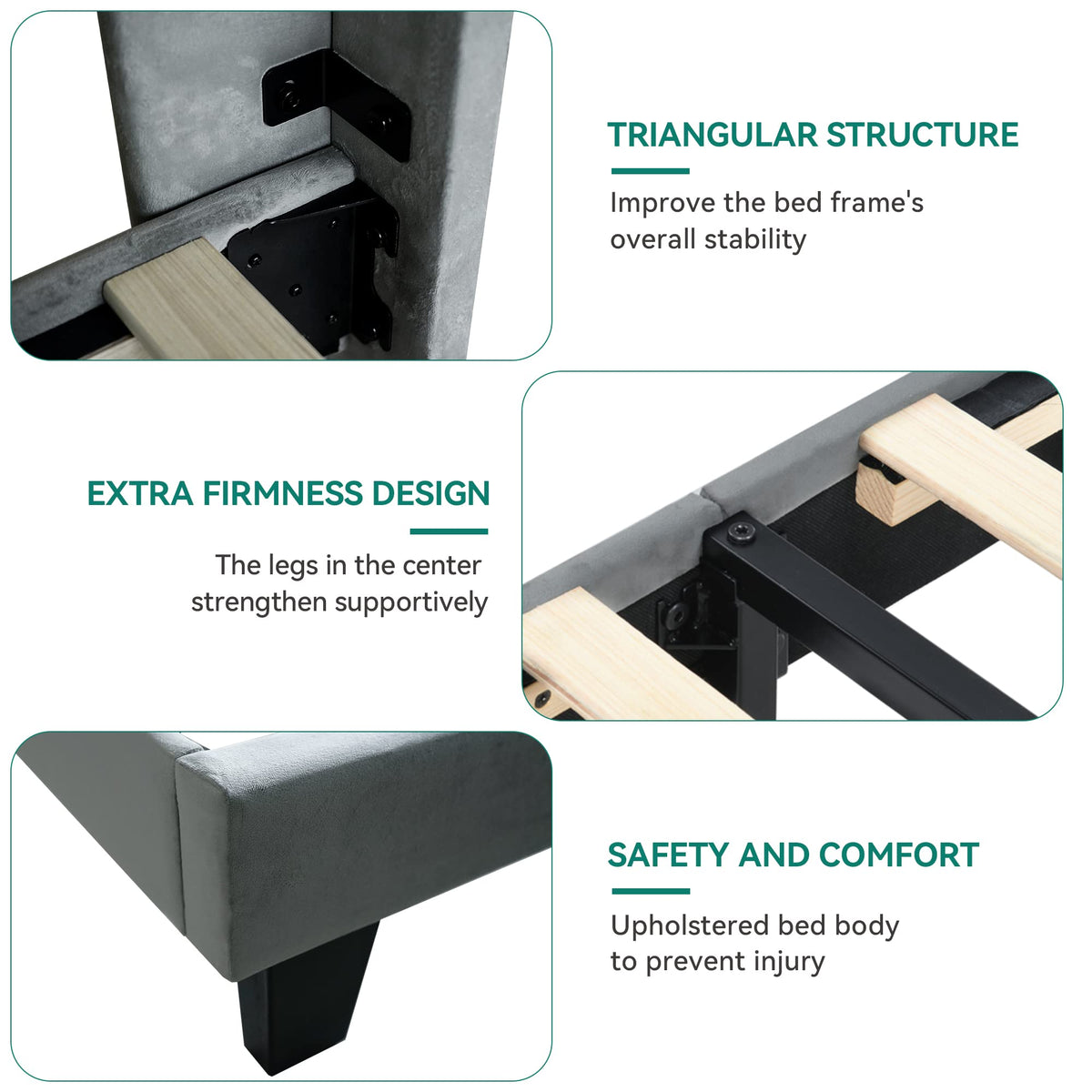 VELVET HEADBOARD- Features a suede surface with square tufting for a classy look; The wingback design ergonomically fits the human curve with no box spring needed; Enjoy premium comfort and relaxation. | STURDY CONSTRUCTION- A thick & sturdy metal frame constructed from premium iron, and the well-selected wood keeps the mattress stable. Enjoy a bed frame with a longer lifespan. | HIGH PERFORMANCE- Middle bed legs are upgraded with anti-scratch foot pads to prevent damage to the floor or mats. Stickers on slats help to reduce noise; Create a noiseless environment for comfortable sleep. | ELEGANT DESIGN- The upholstered platform bed has a minimalist headboard style that looks elegant in your bedroom; Grey color can be well integrated into the room and suit various decorations. | EASY ASSEMBLY- To avoid missing packages, the bed frame is packed in one carton for easy delivery; It may take 30 mins to finish the entire assembly by following the users’ manual. | Please follow the instructions, and professional installation recommended.