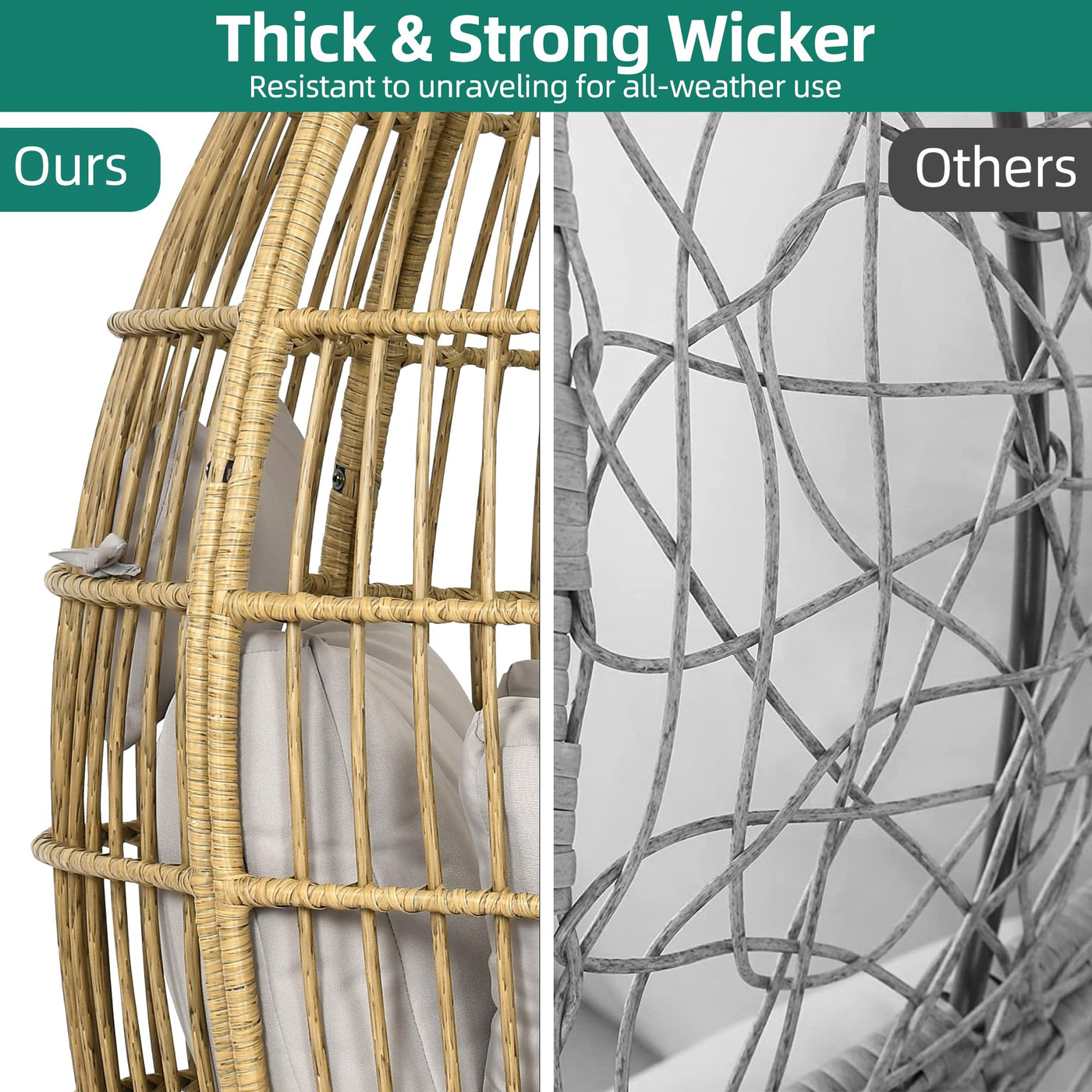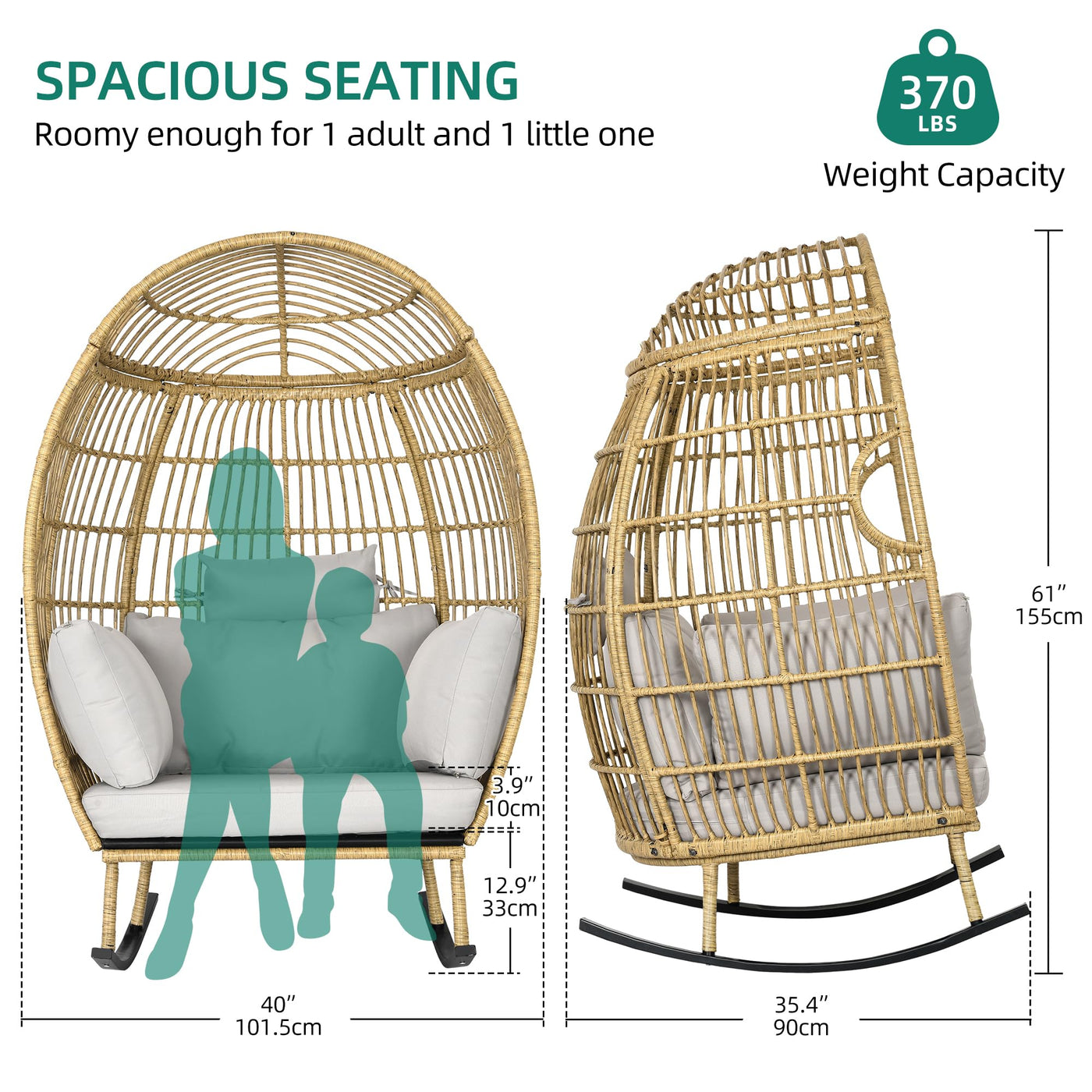 Oversized Egg Chair: Equipped with 4 inch thick, luxurious cushions, as well as lumbar support and headrest pillows, it provides an unparalleled level of comfort. Whether you desire a cozy sanctuary for solitary reading or a haven to decompress after a tiring day, this egg chair is your ultimate retreat, allowing you to fully recline and unwind whenever you please | Enduring Strength & Superior Craftsmanship: Crafted with durability and longevity in mind. Engineered with high-quality rattan material, it effortlessly withstands the harshest elements, including sun exposure, rain, and humidity, ensuring that you can enjoy its exquisite design outdoors without worrying about wear and tear. Indulge in lasting beauty and exceptional quality that stands the test of time | Rocking Egg Chair: Our patio egg chair is equipped with premium non-slip pads, ensuring a secure footing and safeguarding your floors against any potential damage. Immerse yourself in a seamless rocking sensation like no other, and let your worries drift away | Stable Egg Chair: Its sturdy black powder-coated frame and impeccably smooth rocker base guarantee unwavering support, with an impressive weight capacity of 370lbs. For added peace of mind, we have included dual armrests, providing an extra layer of safety and security during your moments of blissful rocking. Embrace relaxation without compromise, knowing you are in safe hands | Egg Chair for Indoor & Outdoor: Ideal for outdoor spaces like gardens, porches, patios, and pools, their timeless design seamlessly transcends traditional outdoor furniture. Be it your living room or bedroom, these modern pieces effortlessly bring the laid-back charm indoors. Embrace versatility and elevate the ambiance of any space with our stunning egg chairs