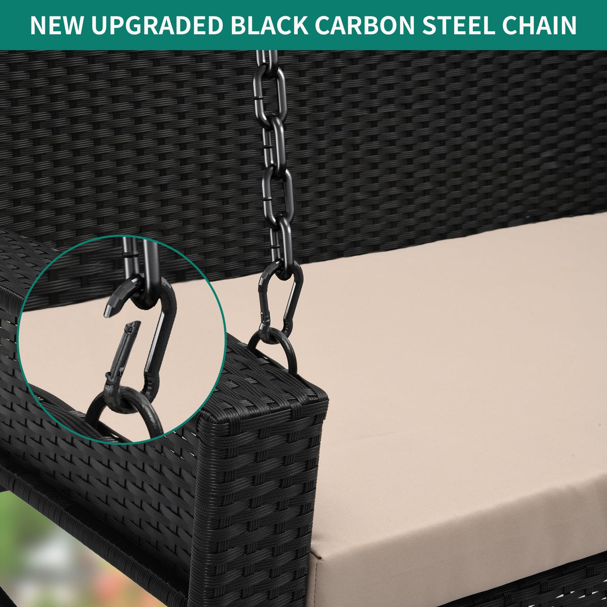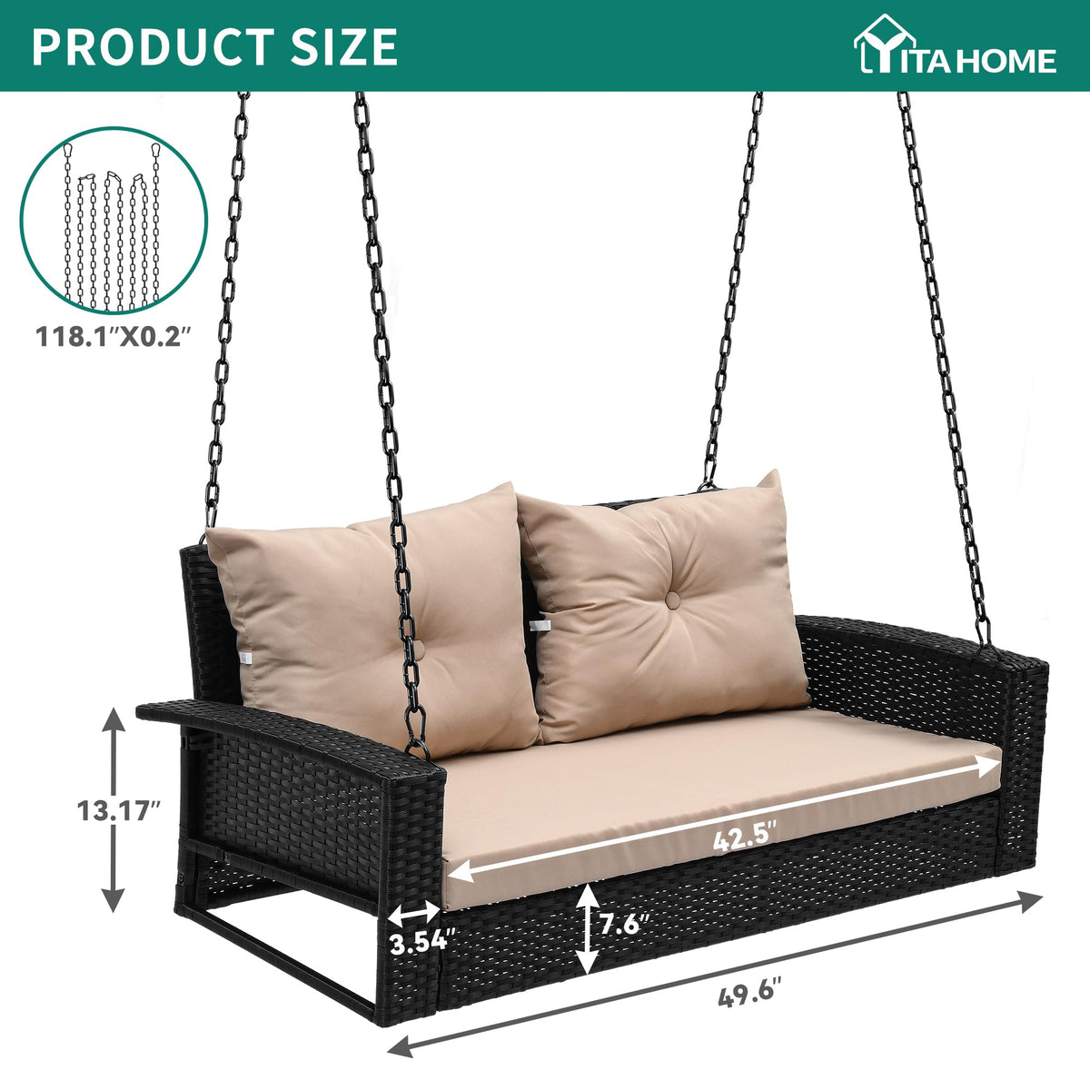 Yitahome Wicker Hanging Porch Swing Chair 2-Seats Outdoor Black Rattan Patio Swing Lounge W/ 2 Back Cushions Capacity 530Lbs For Garden, Balcony, Living Room, Beige
