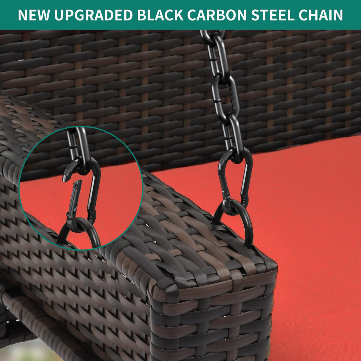 QUALITY RATTAN- The hanging swing chair adopts high-quality 8MM flat brown rattan, which can resist UV for up to 1800 hours and prolong its service life | EXTENDED CHAIN- We are equipped with two 118in hanging chains. You can adjust the height of your chair through the climbing buckle to get high-quality product enjoyment | SOFT RED CUSHION- The wicker porch swing is made of 180g polyester cloth, with two soft pillows and 2.6 pounds of upright cotton. You can sit or lie down, so that you can use it comfortably | STRONG CAPACITY- This patio chain bench can bear up to 530 pounds, and is suitable for two adults to enjoy leisure time on it | EASY TO ASSEMBLE- You can easily install this chain chair within 30min according to the instructions, Safety measures and professional installation are highly recommended | TIPS- Safety measures and professional installation are highly recommended