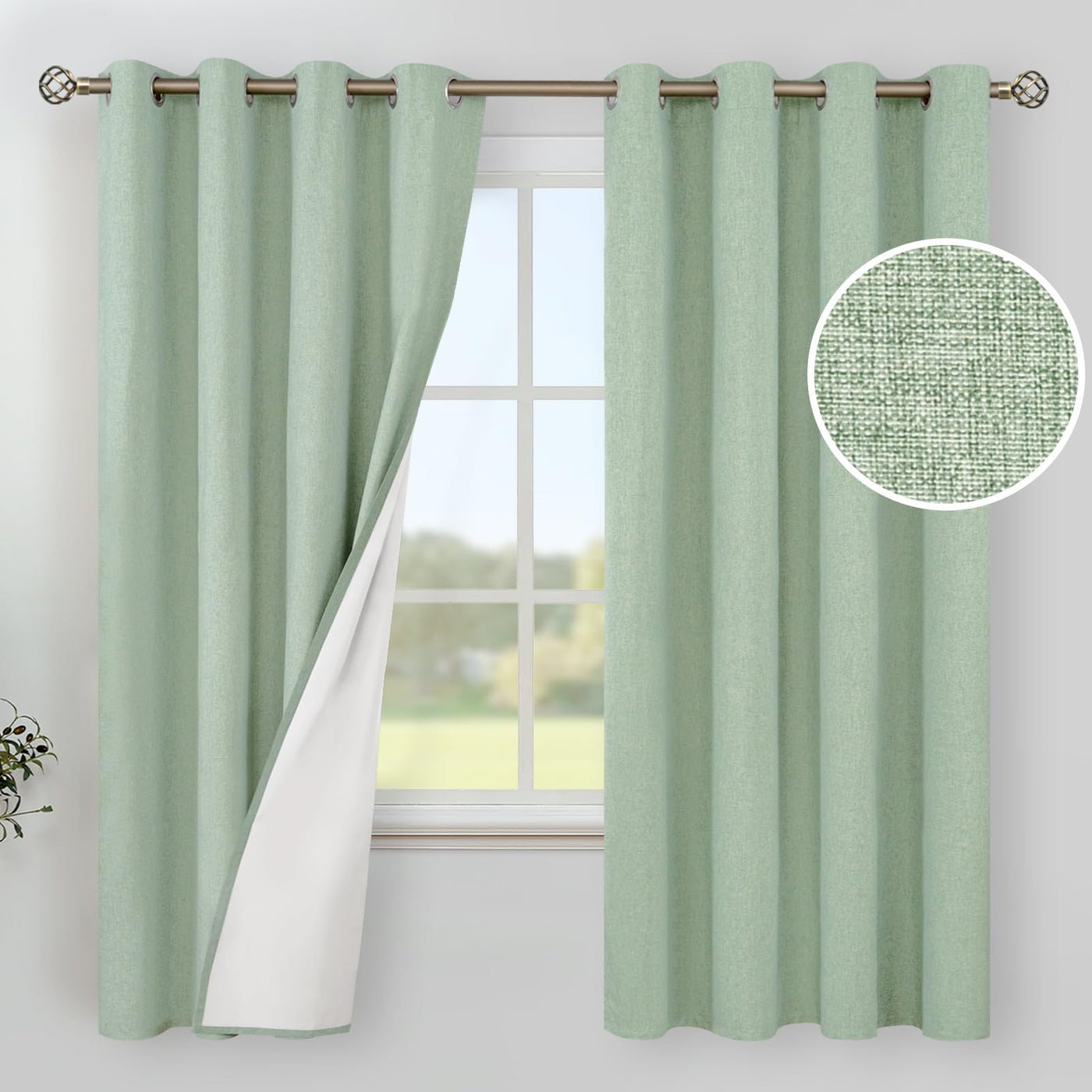 Youngstex Linen 100% Blackout Curtains For Bedroom, Light Green Linen Textured Full Room Darkening Window Drapes Thermal Insulat