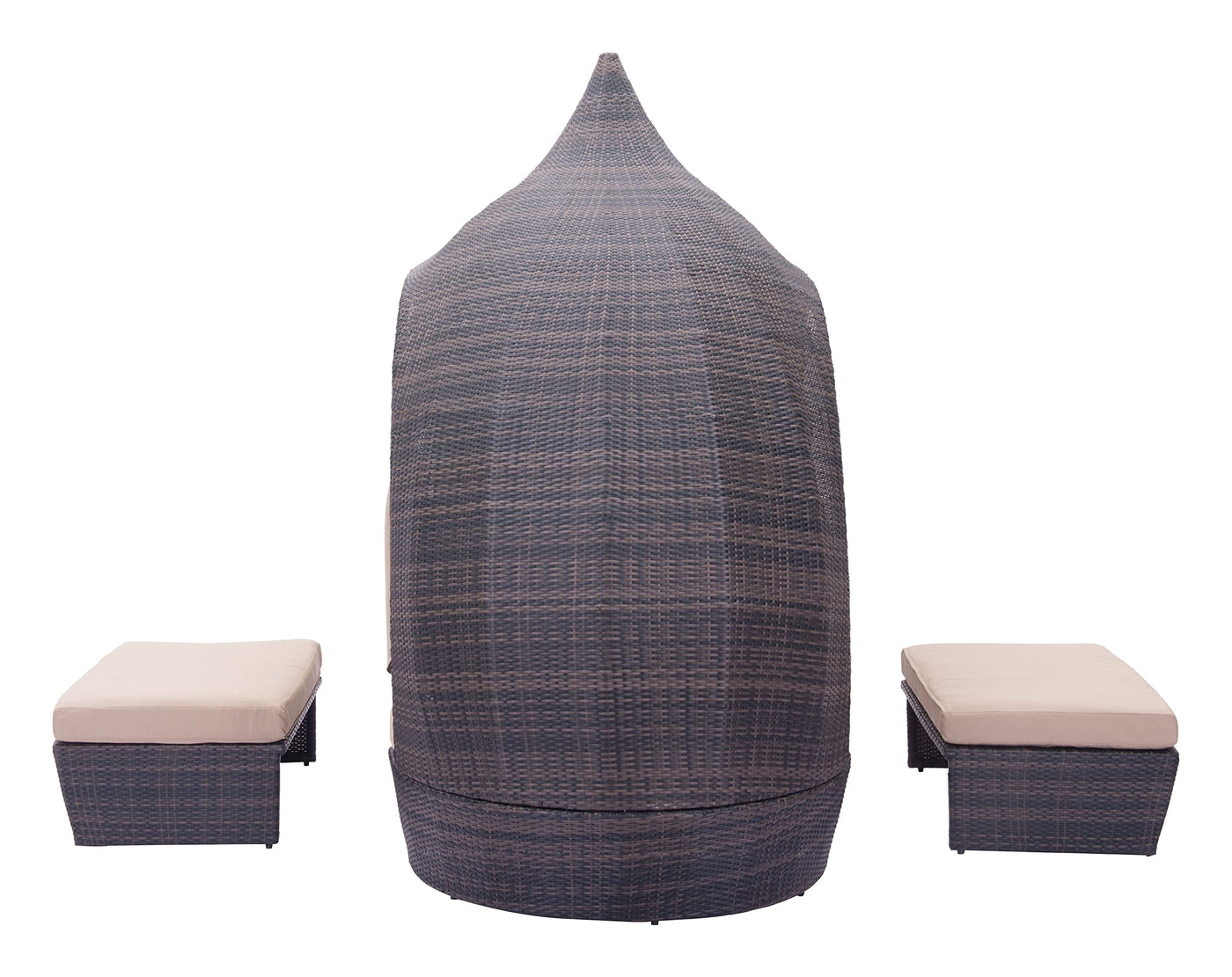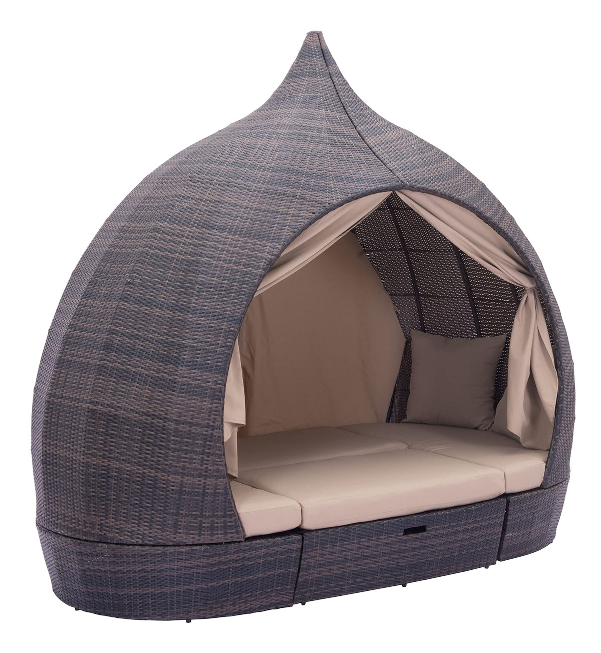 The Majorca Day Bed is constructed from an aluminum frame with a UV resistant polyurethane wicker weave. The cushions are all made from industry leader Sunproof fabrics, which ensure water wicking and UV resistance for any outdoor use. This bed unit has privacy curtains, side tables, and additional ottoman seating for a true beach club atmosphere for any space.