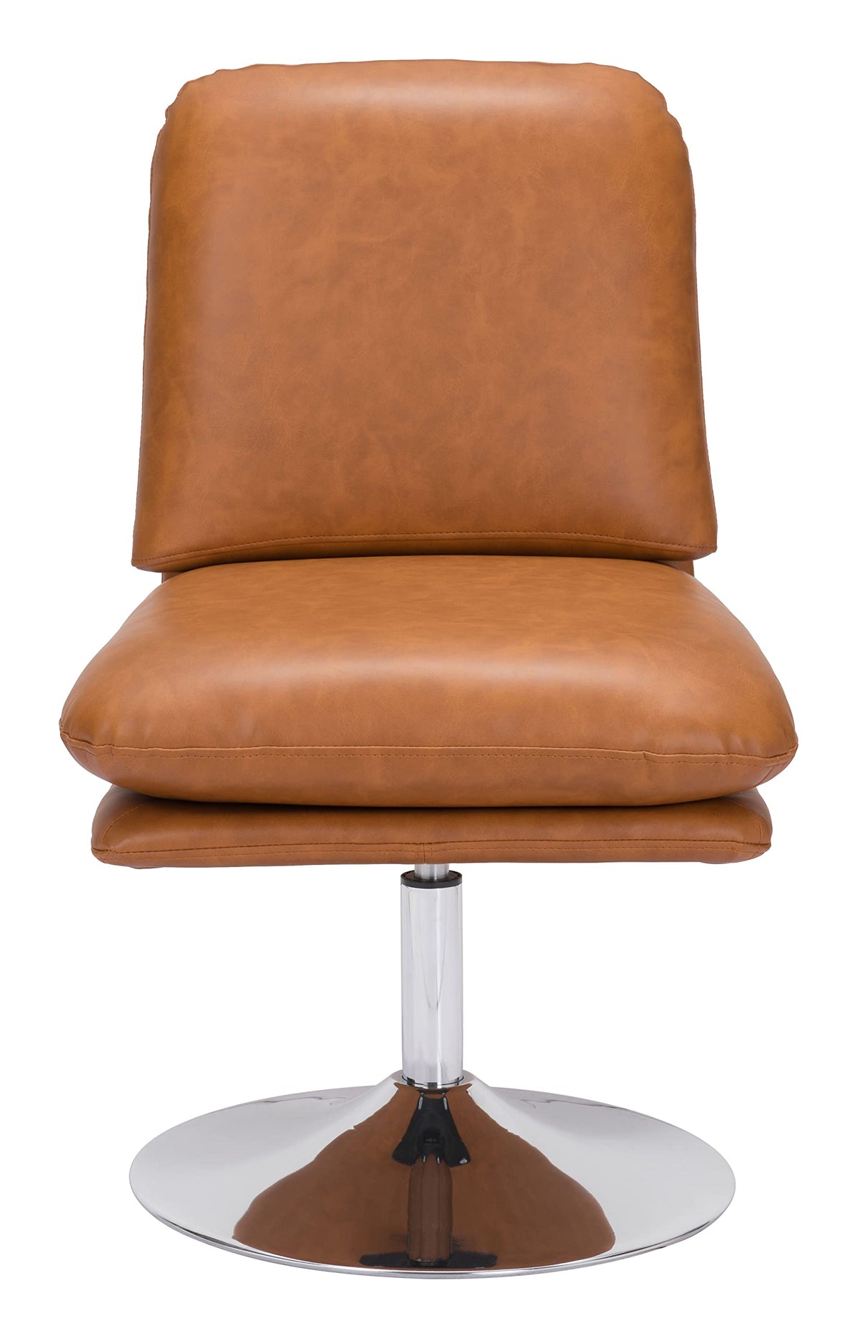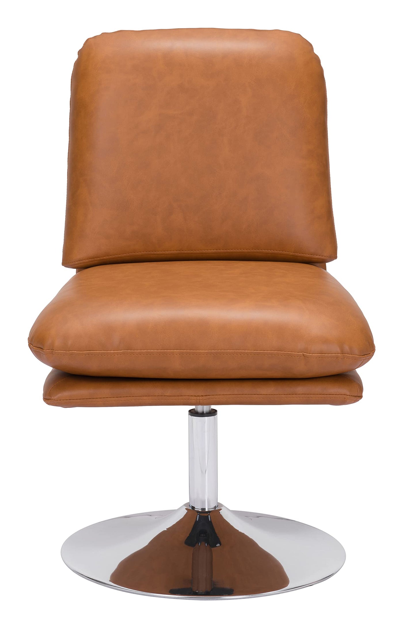 A comfy modern swivel chair, the Rory is wrapped in a plush vinyl body ontop a chrome plated base. This piece works in any space, living room, conference room, or hotel bar.